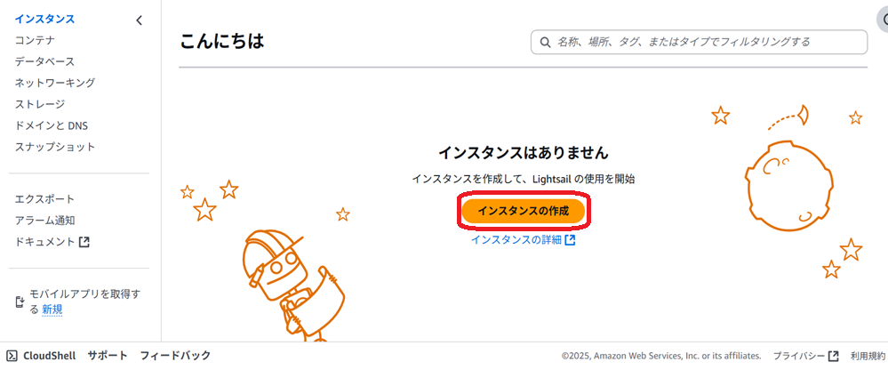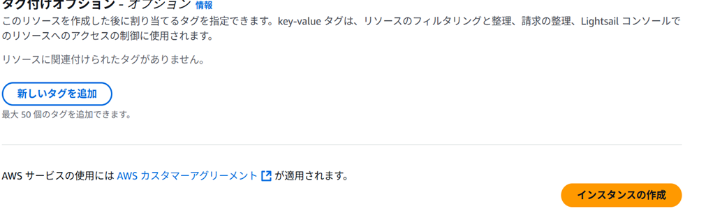 まずはAWSにログインしLightsailの画面に行きましょう!そして以下の画像のようにボタンを押下します!