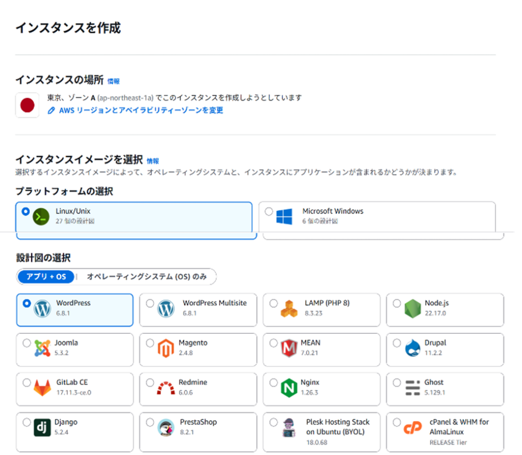 次にLinux、WordPressを選択します。画像が荒いのは許してください。。。この画面は縦に長いので分割しています。